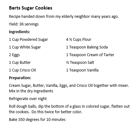 Bert’s Sugar Cookies is a delicious recipe Lynda received from a neighbor nearly 45 years ago!
